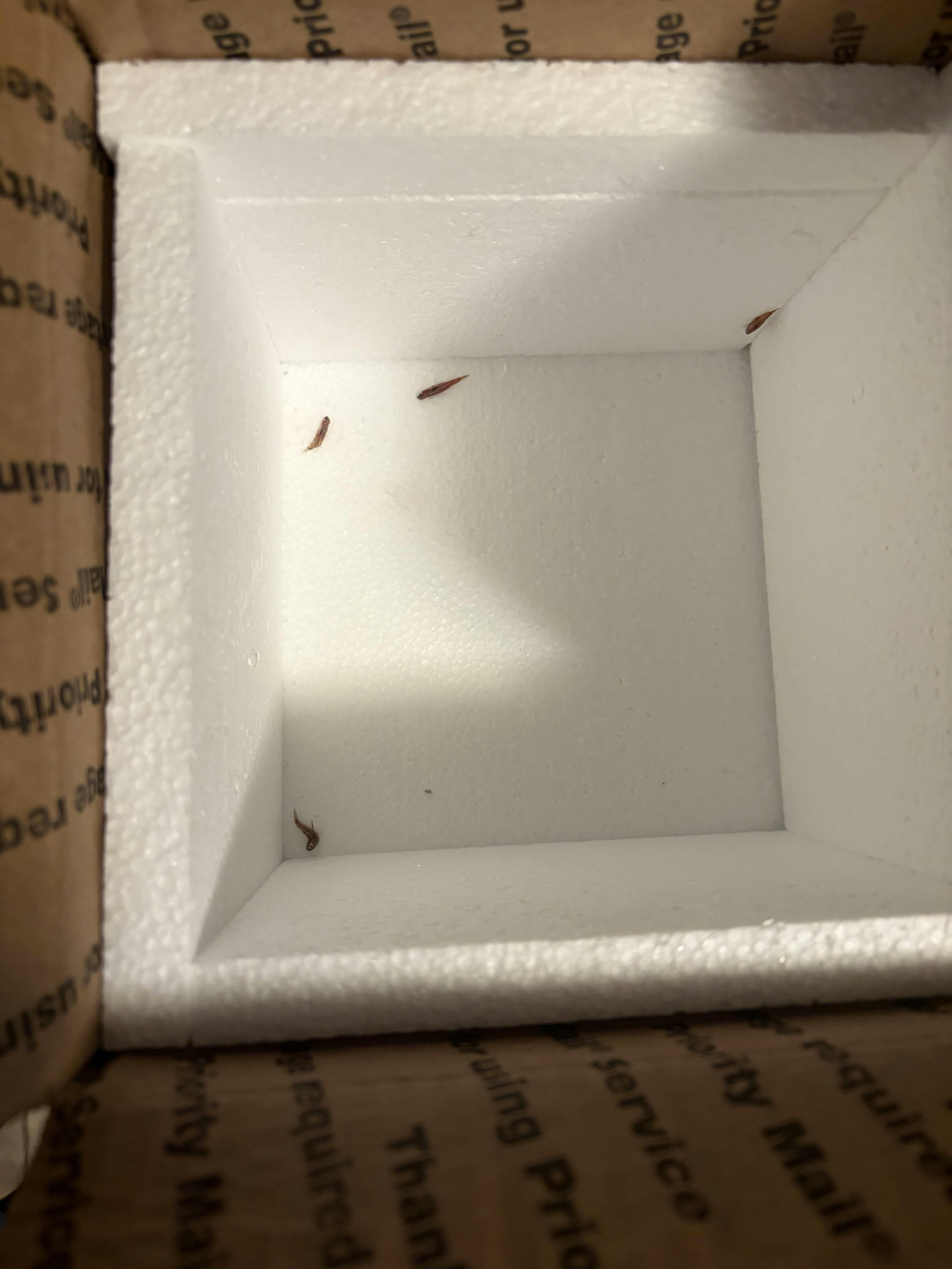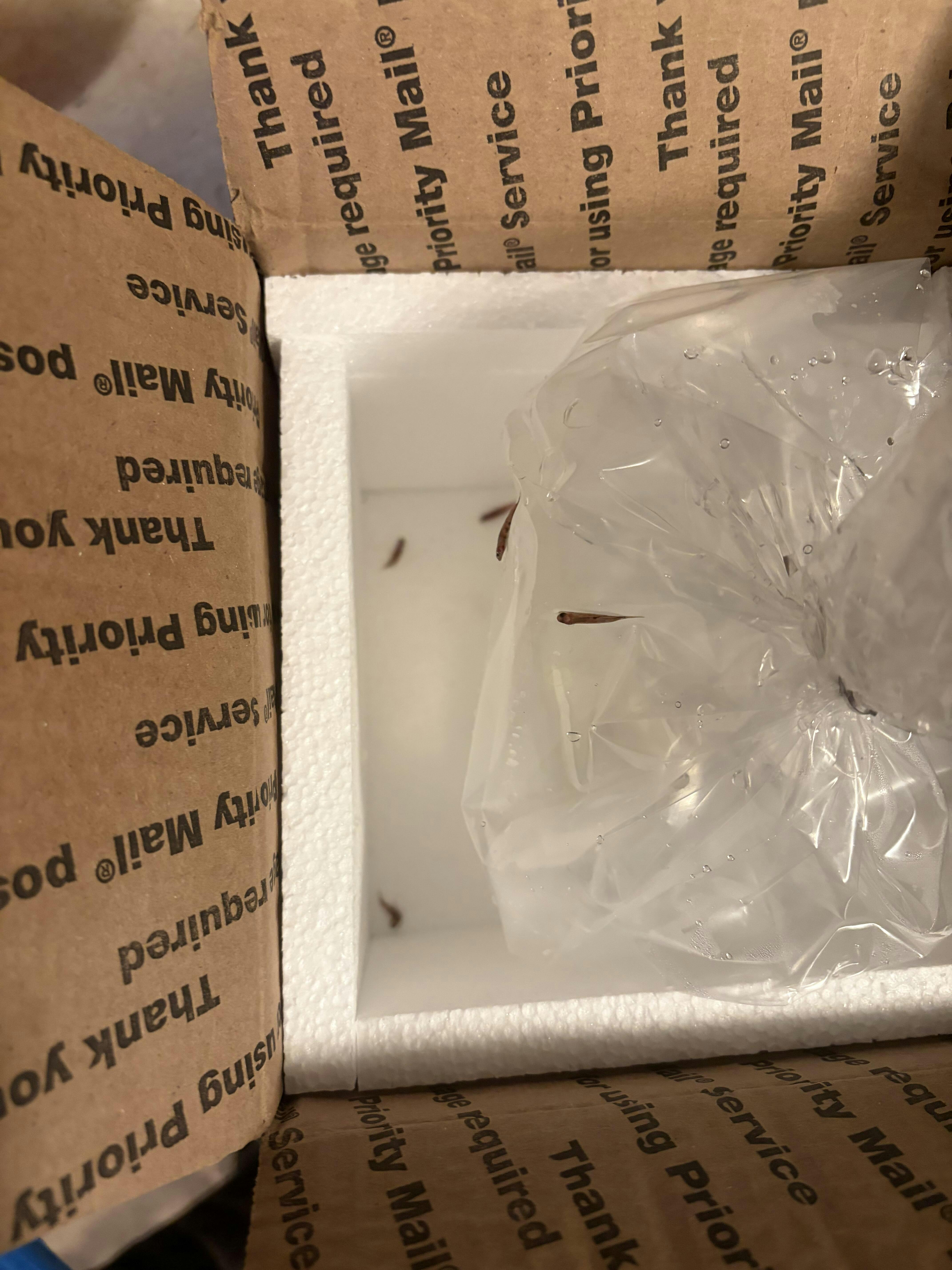 Box arrived, bottom wet. Opened the box. Bag had broken in transit, with 6 dead and out of bag, since 80 percent water gone! 2 we’re clinging to life in water and added to my tank, but now nowhere to be found.